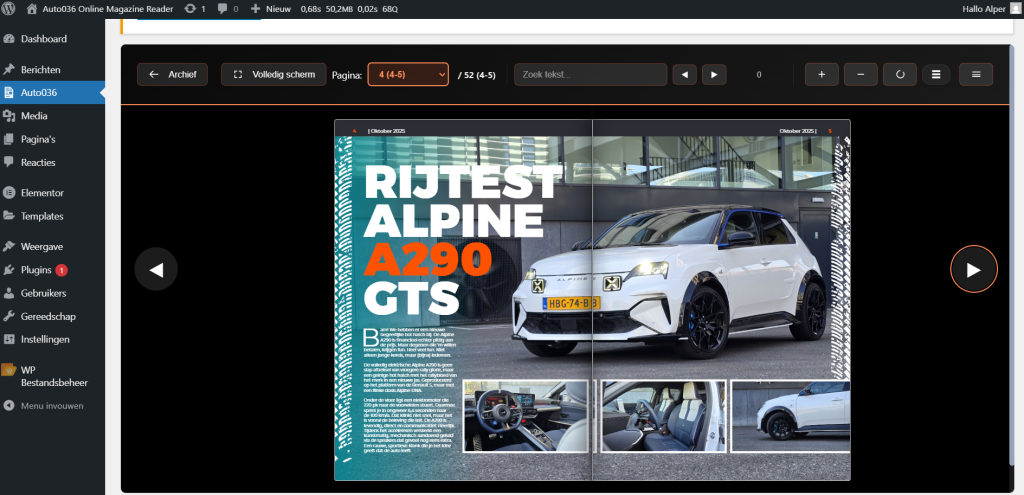 In de beheeromgeving kan de opdrachtgever nieuwe edities toevoegen via een Custom Post Type, inclusief coverafbeelding en PDF-upload. De plugin is ontwikkeld met focus op kwaliteit, overzichtelijkheid en een professionele afwerking, omdat deze daadwerkelijk door Auto036 in gebruik wordt genomen.